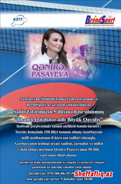 11 dekabr tarixində Stolüstü Tennis Federasiyasının və BrendSport.az saytının təşkilatçılığı ilə Şanlı Zəfərimizin 5 illiyinə həsr olunmuş “İlhamlı Qələbələr adlı Böyük Qayıdış” festivalı çərçivəsində xüsusi stolüstü tennis turniri keçiriləcək. Şəffaflıq.az xəbər verir ki, Turnir, həmçinin 150 illiyi tamam olmuş Azərbaycan milli mətbuatının il üzrə son tədbiri olmaqla, Azərbaycanın ictimai-siyasi xadimi, jurnalist və millət vəkili olmuş mərhum Qənirə Paşayevanın 50 illik xatirəsinə ithaf olunur. Yarışda qazilər, KİV nümayəndələri (jurnalistlər, fotoqraflar, TV əməkdaşları və s.), incəsənət nümayəndələri (aktyorlar, aktrisalar, müğənnilər, modellər və s.), eləcə də Avropa, dünya və olimpiya çempionları, müxtəlif sahələrdən tanınmış ictimai şəxslər iştirak edəcəklər. Buna görə turnirin geniş auditoriyalı və yüksək səviyyəli olması gözlənilir. Qruplar üzrə bölgü: I qrup: Qazi bəylər (öz aralarında) II qrup: Jurnalist bəylər və yuxarıda adı qeyd olunan müxtəlif peşə sahibləri III qrup: Jurnalist xanımlar və yuxarıda adı qeyd olunan digər sahələrdən peşə sahibləri Hər qrup üzrə ilk 4 yerin qalibləri pul mükafatları və sponsor hədiyyələri ilə təltif olunacaqlar. Tədbir 11 dekabr, saat 10:30-da, “Şua” idman kompleksində start götürəcək. ( Azərbaycan Stolüstü Tennis Federasiyasının bazası ) İştirakçılar üçün idman geyimi və idman ayaqqabısı gətirmək məcburidir. Digər bütün oyun ləvazimatları təşkilatçı tərəfdən təmin olunacaq. Qeydiyyat üçün iştirakçılardan iş vəsiqəsi və şəxsiyyət vəsiqəsi, qazilərdən isə müvafiq sənədlər tələb olunur. Qeydiyyat: 070-286-86-29 (WhatsApp) Son qeydiyyat tarixi: 8 dekabr, saat 18:00