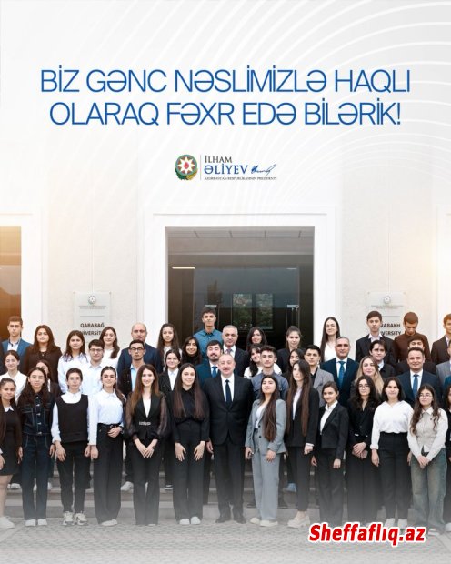 Azərbaycan Prezidenti İlham Əliyev 2 Fevral - Azərbaycan Gəncləri Günü münasibətilə sosial şəbəkə hesablarında paylaşım edib. Şəffafllıq.az xəbər verir ki, paylaşımda deyilir: "Biz gənc nəslimizlə haqlı olaraq fəxr edə bilərik!"